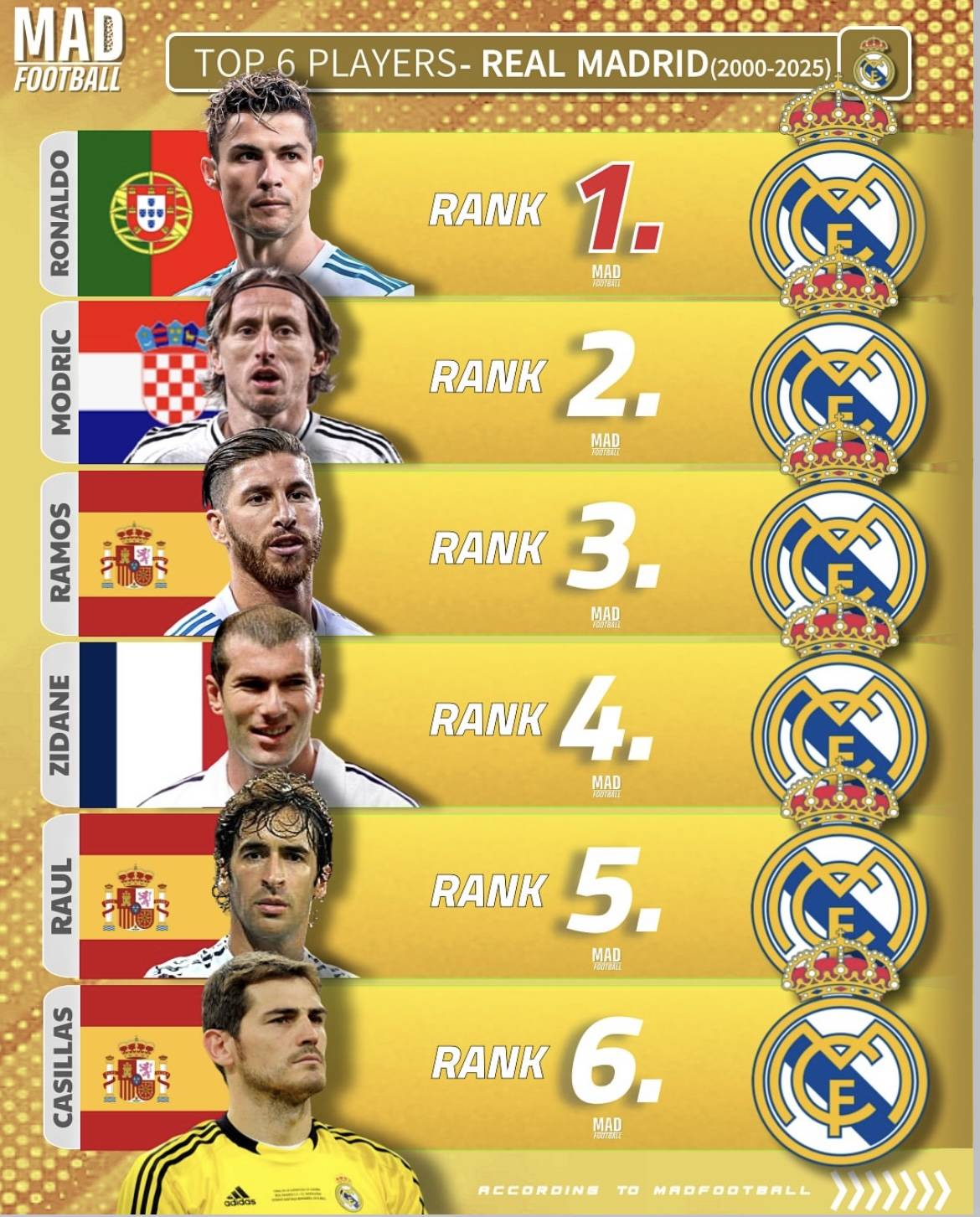 巴塞罗那方面,梅西毫无悬念地占据榜首位置,紧随其后的分别是伊涅斯塔、哈维、罗纳尔迪尼奥、普约尔以及布斯克茨。皇家马德里方面,C罗则力压群雄,独占鳌头,莫德里奇、拉莫斯、齐达内、劳尔和卡西利亚斯分列其后。